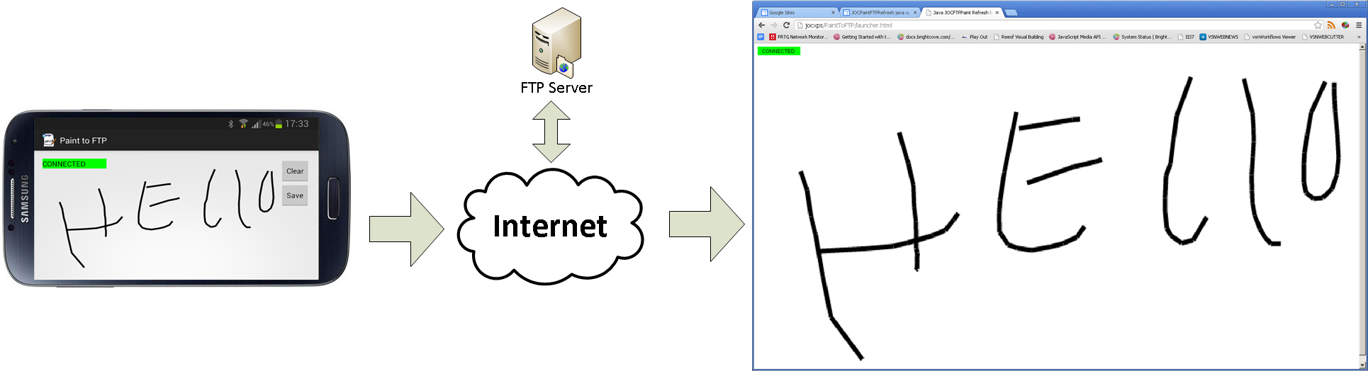 Allows you to paint on the screen of your mobile device (IOS or Android), and when the mobile app detects that the drawing has changed, it is sent automatically to the configured FTP server. And using the JOCPaintFTPRefresh java applet the images that are available in that FTP server can be viewed in any web browser, and they are automatically refreshed at the moment that the image changes in the origin (mobile device).